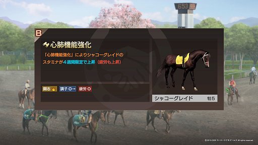 期間限定型の絆コマンドも印象的だ。その中の1つである「心肺機能強化」は「競走馬のスタミナが4週間限定で上昇するが,疲労も上昇する」というもの。外せない大勝負の1か月前に使うのが有効だが,絆コマンドの使用回数には月ごとに制限があるため,そちらも確保しておかなければならない。能力をブーストする絆コマンドの魅力と,「Winning Post」シリーズらしいマネジメントの面白さがうまく組み合わさった感がある。
