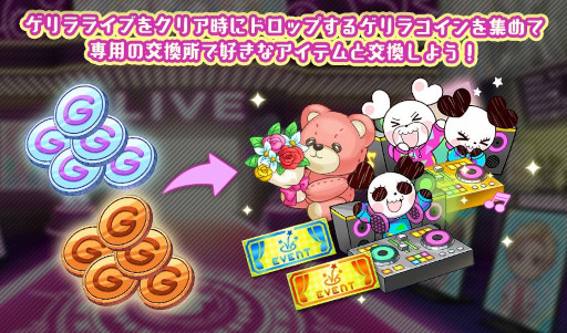 ゲリラライブをクリアするとイベントptや専用アイテム「ドリームゲリラコイン」を獲得できます。「ドリームゲリラコイン」は『ドリームゲリラコイン交換所』で好きなアイテムと交換できるので、どんどんゲリラライブに参加しましょう!