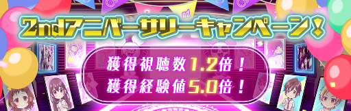 開催期間中、 ライブクリアで獲得できる視聴数が1.2倍、 経験値が5.0倍となっております。 この機会にぜひ、 キャラの育成やライブランク報酬の獲得などにお役立てください!