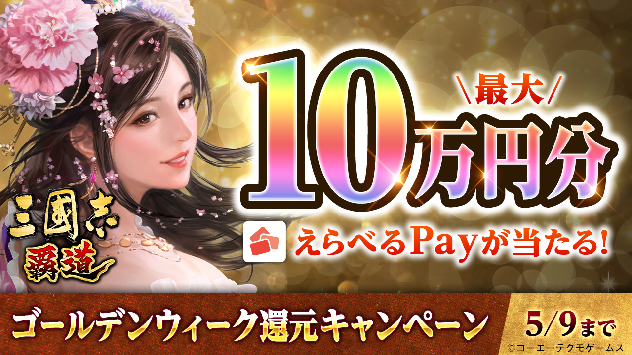 「三國志 覇道」で最大10万円分のえらべるPayが当たるゴールデンウィーク還元キャンペーンが開催に