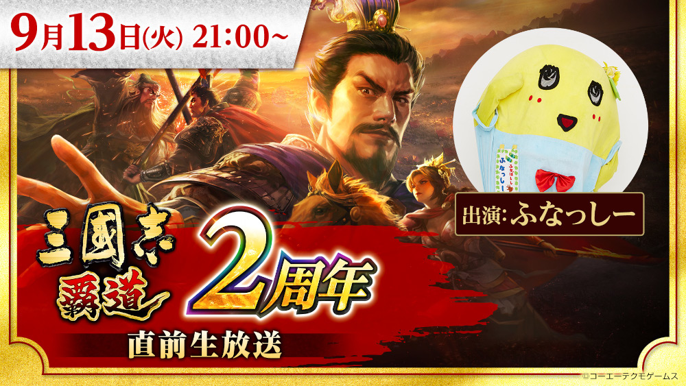 「三國志 覇道」2周年直前生放送を9月13日に実施。ふなっしーが再び登場
