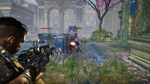 ギアーズシリーズと言えば,遮蔽物に身を隠す(カバー)アクションが重要だが,これは「Gears Tactics」でも同様だ。建物や植え込み,車止めなどに身を寄せれば,その陰に隠れて,敵から攻撃されても命中率を引き下げることができる。逆に,視界が開けたところでターンを終えようものなら,ハチの巣にされてしまうだろう。