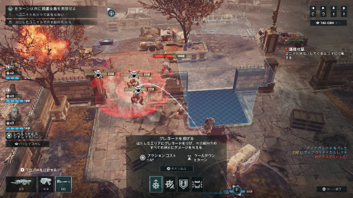 また,敵のHPを削ると行動不能のダウン状態になる。このまま放置しておくと仲間が蘇生してしまうため,しっかりと息の根を止めなければならない。銃撃でケリをつけてもいいが,接近してとどめコマンドを使って倒すと,仲間全員のアクションポイントが1増加する。