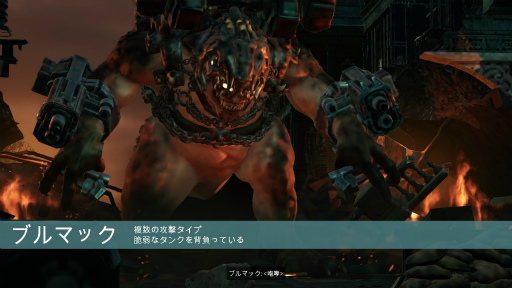 「ブルマック」戦では両手のチェーンガンを潰した後,背中のタンクを狙うという流れになる。しかし,タンクは後方からしか攻撃できないばかりか,ブルマックは撃たれるたびに向きを変えてタンクを庇おうとする。どこを向いていてもタンクを狙えるように,包囲した状態で攻撃したいところだが,カバー無効の範囲攻撃や即死のミサイルをひっきりなしに撃ってくるうえ,ローカストホールからレッチの群れが湧いてくるという有様だ。通常のセオリーがまったく通用せず,頭を悩ませることになるだろう。
