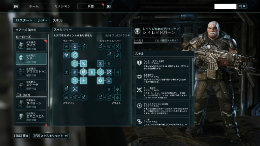 COG兵士にはタフな「前衛兵」,回復スキルを持つ「支援兵」,遠距離から敵を撃つ「狙撃兵」,ショットガンでの近距離戦を得意とする「斥候」,ミニガンで仲間をサポートする「重装兵」が存在する。経験値が一定値に達するとレベルが上がり,スキルポイントを4系列のスキルに振り分けられる。