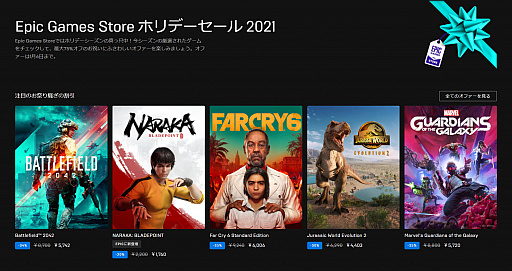 ストアのトップページを見ると,「Battlefield 2042」(34%オフ),「NARAKA: BLADEPOINT」(20%オフ),「ファークライ6」(35%オフ)など,リリースされて間もないゲームタイトルが並んでおり,思わずグッとくる。「フォートナイト」のコスチュームや「Warframe」の武器など,人気タイトルのアドオン系も充実しており,それらの多くが無料配信されているため,とりあえず欲しいゲームはないけれど,という人もチェックしておいて損はなさそうだ。