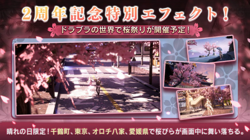 柔らかな風が吹き、桜が咲きそうな気配を感じますね。ドラブラの世界では、一足お先に春風が桜の花びらを運んできましたよ!晴れの日限定で、2周年記念「特別・桜舞うエフェクト」が、東京・千鶴町・カッセル学院・オロチ八家・愛媛県で舞い落ちます。そして、桜が咲き始める予兆も…?!ドラブラの桜開花情報は後日公開!ぜひ、仲間と一緒にお花見へ出かけましょう!