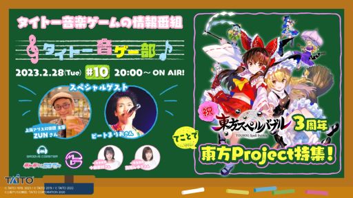 第10回放送となる2月28日(火)の配信では、「東方Project」の生みの親である「上海アリス幻樂団」主宰のZUNさんと、「東方Project」楽曲の有名アレンジを数多く手掛けてこられたビートまりおさんをゲストにお招きし、2月6日(月)にリリース3周年を迎えた『東方スぺルバブル』の他、タイトー音楽ゲームと「東方Project」とのこれまでの歩みを振り返ります。最新情報も盛りだくさんにプレイヤーの知りたい情報・見たいプレイをより早く詳しくお届けします。