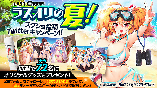 期間中に「公式Twitter(@lastorigin_info)」をフォローし、「#ラスオリの夏」をつけて、Twitterに「夏」をテーマにしたゲーム内のスクリーンショットを投稿すると、抽選で72(ナツ)名にオリジナルグッズをプレゼント!