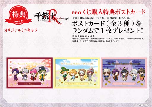 『千銃士:Rhodoknight』の「eeoくじ」を10枚お買い上げごとに、ポストカード(全3種)をランダムで1枚プレゼント!こちらのポストカードは1会計1枚の配布で、数量限定となっています。なくなり次第、配布終了となりますので「eeoくじ」のご購入はお早めに!