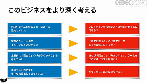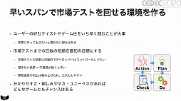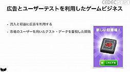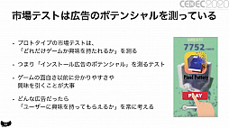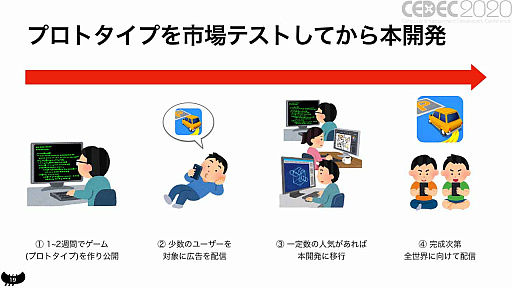 「アメリカの無料ゲームランキングトップ100のタイトルをチェックしてゲームの要素を細かく分析し,自分で作るときに意識する」というアドバイスを贈った。分かりやすさが勝負のハイパーカジュアルゲームにおいて,ヒットしているタイトルに無駄な要素はないからだそうだ。そのうえで,プロトタイプを素早く開発して市場テストを行える環境を構築。まずは難しい市場テストの通過ではなく,比較的実践可能な開発日数の短縮を目標にするといいのだという。