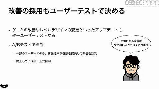 正式配信後のアップデート前には,A/Bテストが用いられる。一部のユーザーに新機能や改善を加えたバージョンを配信し,そうでないユーザーとの反応を計測。反応が悪ければ,そのアップデートは没になってしまう。