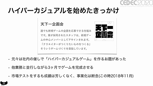 佐藤氏がハイパーカジュアルゲームに携わることになったきっかけは,社内で行われたゲームアイデア募集企画に応募したことだったという。最初は3か月でゲームを作るも,市場テストの反応が悪く,残念ながら没に。その後有志に声をかけて再始動し,業務時間外で新たなゲームを作り始めたのだ。