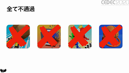 まずは広告だけで興味を持ってもらわなければならないため,ゲーム内容は年齢,性別,国籍を問わず興味を惹くものとする。1〜2週間でプロトタイプを制作し,その後に少数のユーザーに向けて広告を配信する「市場テスト」が行われ,インストールしてくれた数が基準に満たなければ没になるという,スピーディーな開発と過酷な生き残りが求められる。佐藤氏いわく「10本作って1本が通ればいいほう」というから,なんとも狭き門だ。