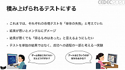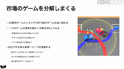 佐藤氏は,ここまでのやり方を「ただ作っていた」だけであったと反省する。そして,市場テストとは「広告のポテンシャルを見るもの」で,ハイパーカジュアルゲームのユーザー層は,ゲームの広告から流入してくることから「普段から自らゲームを探して遊ぶ人ではなく,ゲームを遊ぶことを主目的としない,純粋に楽しい時間を過ごしたい人」。そして,ゲームのモチーフは主観で選ぶのではなく,客観的な視点を持ちつつ「走る車,物体を引きつける磁石など,モノ自体の振る舞いやゲーム性を説明するものを選ぶのが大事」……であると認識を変えたという。そのうえで,市場テストを通過できなかった失敗を単体のものと捉えず,成功への過程の一部と考えるようにしたのだ。