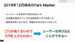 こうして2019年11月に世に出た「Park Master」。12月7日には無料アプリランキングの3位になったものの,約3週間後の12月26日には339位と急降下してしまった。インストール数は伸びたものの,継続率が高くないため利益が出ず,ユーザーを呼び込むための広告費をかけられないという状態になったという。