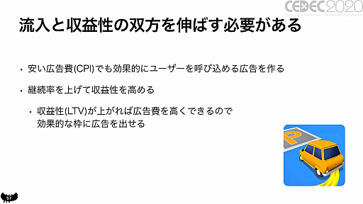 「安い広告費で効果的にユーザーを呼び込める広告を作る」「継続率を上げて収益性を高める」の2点である。
