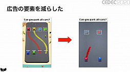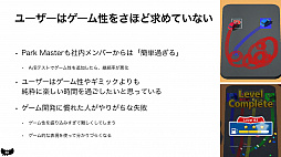佐藤氏は,良いハイパーカジュアルゲームの条件について「広告だけで遊び方やどんな体験ができのるのかが伝わる分かりやすさ」,「誰からも拒絶されないアートによる親しみやすさ」「今まで遊んだことのないユニークな面白さ」と分析。そのうえで,プレイヤーはゲーム性やギミックよりも純粋に楽しい時間を過ごしたいと考えており,ゲーム開発に慣れたスタッフがやるような,ゲーム性の盛り込み過ぎには気を付けたいと語った。「Park Master」の場合,社内テストで簡単過ぎるという評価が出たため,ゲーム性を追加したバージョンを開発。従来版とA/Bテストを行ったところ,継続率は落ちたそうだ。
