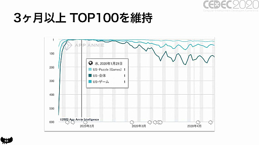 広告の改善だけで無料ゲームの1位に返り咲き,3か月以上トップ100位圏内をキープしたというのだから,ハイパーカジュアルゲームビジネスにおける広告の重要性が分かるだろう。