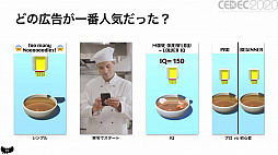 「Noodle Master」だ。本作の広告は,「シンプル」「実写でスタート」「麺がどんぶりからこぼれる程にIQの数値が下がる」「プロと初心者のプレイを並べて比較する」という4パターンが作られた。最も効果的なのは最後の