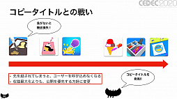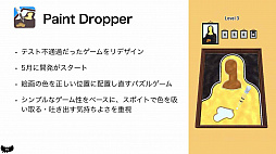 「Paint Dropper」では,コピータイトルとの戦いが繰りひろげられた。同作は,スポイトを使い,絵画から誤った色を吸い取り,正しい配色に戻すというパズルゲーム。テスト配信後にA/Bテストによる改良を進めていたところ,同じアイデアのコピータイトルが発見された。先を越されてはマズイということで公開を優先し,機先を制することができたという。