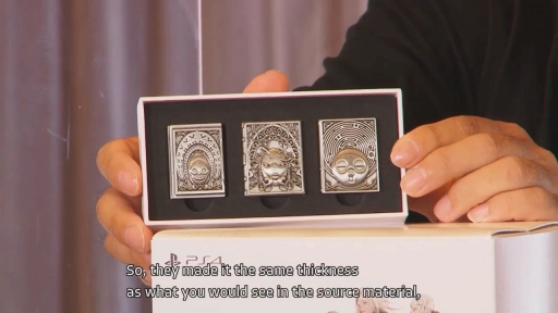 ピンバッジは,ゲームに登場する「白の書」「黒の書」「深紅の書」をそれぞれ再現したもので,当初は薄めの取り付けやすいものだったのが,原作再現のこだわりによって厚みが9mmとなり,ヨコオ氏の表現を借りると“重たくてセーターなどに付けてももげる”重量になったとのこと。服につけるのは難しいかもしれないが,存在感があって自立も可能なため,部屋に飾るのにオススメ(?)できそう。