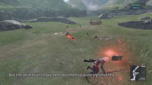 自身でデバッグ画面とプレイヤーキャラクターを操作し,昼の北平原のフィールドに魔物を“召喚”(デバッグモードで配置)してそれを倒すという形で,“新バージョン”のアクションを披露。ビジュアルはそのままに新たなモーションで動き回る敵や,スピード感がアップし爽快さが増したキャラクターの動きを紹介した。