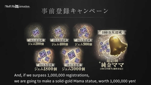 今回の情報公開に合わせて事前登録受付も開始。登録者数50万人達成でガチャ10回分相当のジェムが,100万人達成で100万円相当の純金で仕上げたママ(本作の重要キャラクター)が1名にプレゼントされるとのこと。北米と欧州に向けた海外配信も決定し,こちらも今後の展開が楽しみなところだ。