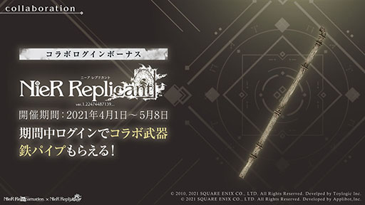 本日より、『NieR Replicant ver.1.22』コラボレーション武器「鉄パイプ」がもらえるログインボーナスを開催いたします。