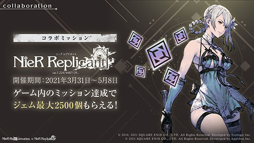 本日より、『NieR Replicant ver.1.22』コラボレーションミッションを開催いたします。ゲーム内のミッションを達成することで、最大「ジェム×2500」を手に入れることができます。