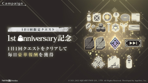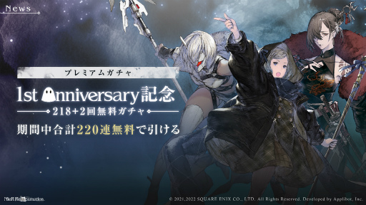 株式会社スクウェア・エニックス(本社:東京都新宿区 代表取締役社長:松田 洋祐)は、株式会社アプリボット(本社:東京都渋谷区 代表取締役社長:浮田 光樹)開発による、「NieR」シリーズ初のスマートフォン向けタイトル『NieR Re[in]carnation』(ニーア リィンカーネーション)は、2022 年 2 月 18 日(金)にサービス開始から1周年を迎えました。これを記念して、2022年2月18日(金)より、「1st Anniversary 記念キャンペーン」を開催いたします。