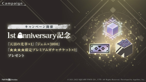 1st Anniversary 記念として、「天頂の光華×1」「ジェム×3000」「★★★★確定プレミアムガチャチケット×1」をプレゼントいたします。