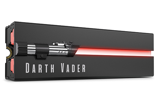 製品には,ヒートシンク付きのSSD本体に加えて,ルーク・スカイウォーカー,オビ=ワン・ケノービ,そしてダースベイダーのライトセーバーをデザインした3種類のフェイスプレートが付属しており,好きなものを取り付けて使用できる。ヒートシンク部分に組み込まれたLEDによって,ライトセーバーの光線部分が光るギミックが魅力的だ。