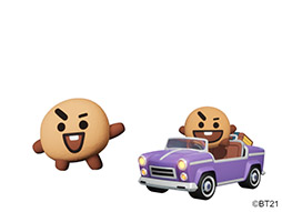 アイテムショップにて、ゲーム内で使用可能な『BT21』の7キャラクター、KOYA、RJ、SHOOKY、MANG、CHIMMY、TATA、COOKYをご購入いただけます。加えて、各キャラクターのエモート(ゴール時などに設定できるアクション)や絵文字、カートカスタマイズ用のステッカーとナンバープレート、さらに『BT21』をイメージしたカートボディも販売いたします。