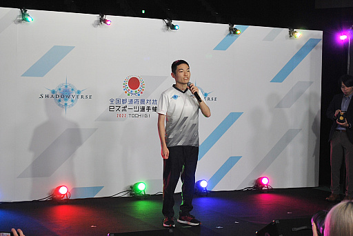 「Shadowverse」部門はここまでに紹介したほかの種目と異なり,ブースには実況席と対戦映像が見えるモニタのみが設置。選手はブースの裏で対戦し,対戦前の挨拶と,結果発表の際にだけ登壇するという独特の形で大会は進行した。
