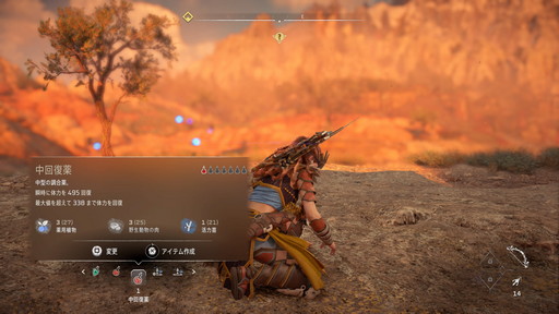 アーロイがダメージを受けたときの回復手段についても頭に入れておきたい。資源として入手する「薬用植物」と,アイテムとして入手する「薬」の2種類があり,ともに回復の質が異なっている。