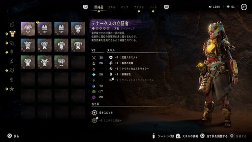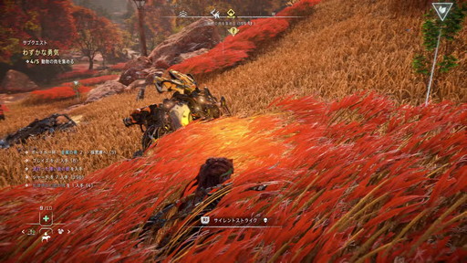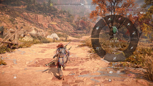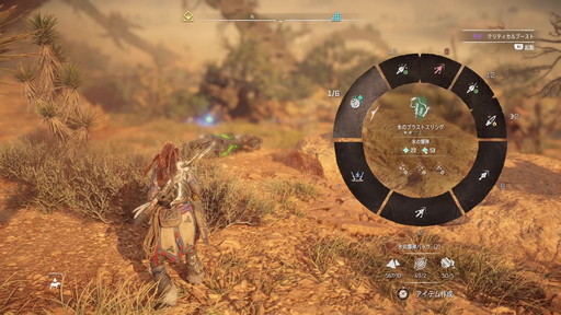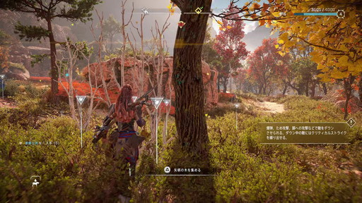 最後に,狩りと採集の重要性についても触れておきたい。狩りは機械獣に限らず,野生動物も対象であり,得たものによって装備の強化やポーチの容量増などを行え,旅を有利にしてくれる。
