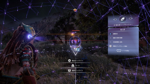 植物はフィールドのそこかしこに生えていて,パルスを使えば容易にその場所を知れる。薬用植物の採集が主となるが,矢弾を作る「矢柄の木」や,アーロイの能力を一定時間上げる料理を作ってもらうため材料,防具の色を変える染料など,役立つものが手に入る。