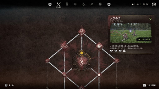 コンビネーションは後述する「戦士」カテゴリーのスキルで身に付けられるようになっていて,[R1]×2→[R2]で繰り出す「防御崩し」(対象の防御を崩す),[R1]×3→[R2]で繰り出す「ノラの矛」(多段ヒットして小型の機械はダウン,大型機械はよろめかせる),[R1]→[R2]長押しの「飛び退き&空中切り」(素早く敵を攻撃して敵から飛び退く,または飛び上がる)あたりは使い勝手がいいので早いうちに習得しておくといい。