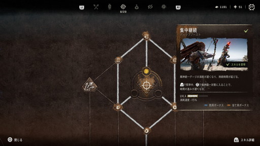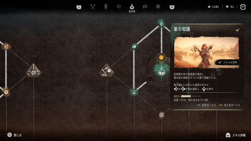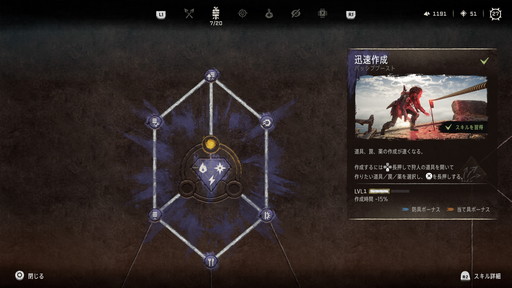 スキルは「戦士」「罠」「狩人」「生存」「隠密」「機械」の6つのカテゴリーがあり,それぞれにツリーが用意され,その中心には「勇技」という強力なスキルが存在している。