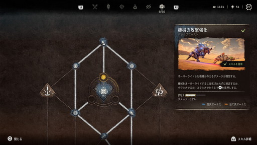 「機械」は,機械獣を味方にするオーバーライドに関するスキルが揃う。序盤のアーロイがオーバーライドできる機械獣はわずかなので,必然的にほかのスキルが優先されることとなるが,機械炉を2〜3攻略して,オーバーライドできる種類が増えたところでその有効性が一気に上がる。勇技は機械獣の弱点へのダメージが増加する「パーツブレイカー」と,攻撃対象の15メートル以内の敵複数にダメージが連鎖する「連鎖バースト」。