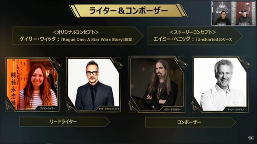 エラさんのほかにも,有名な海外スタッフが多く参加している点が紹介された。それもそのはず,本作のオリジナルコンセプトは「Rogue One: A Star Wars Story」の原案で知られるゲイリー・ウィッタ氏が務め,ストーリーコンセプトは「アンチャーテッド」シリーズのエイミー・へニッグ氏が担当。そしてリードライターにはアリソン・ライマー氏(代表作:「Shadowhunters」)とトッド・スタッシュウィック氏(代表作:「Devil Inside」)が参加している。