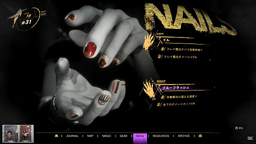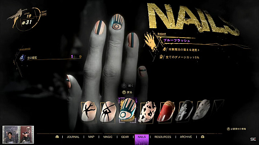 装備品とは別カテゴリとなるが,ネイルというカテゴリも存在する。ネイルは右手と左手で別のネイルが設定でき,ネイルもマントやネックレスと同様付与されているアビリティの恩恵が受けられる。
