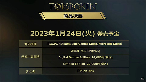 最後に,寺田氏は本作がLuminous Productions最初の作品であり,ここに全力を尽くしてきたことを強調。「FORSPOKEN」というIP自体を知ってもらい,その名前を好きになってもらいたいと話した。光野氏は最高のストーリーと最高の音楽,魅力的なキャラクターたちで,みなさんが楽しめるゲームになっていると締めくくって,番組は終了した。