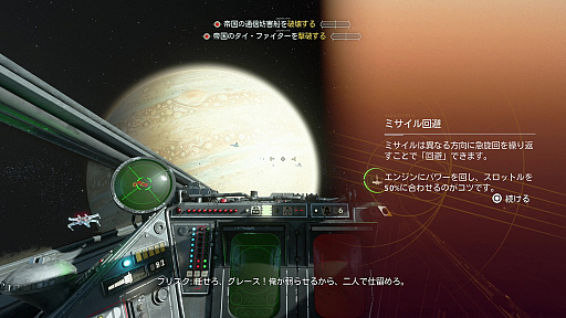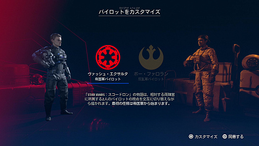 注目すべきは,ソロプレイのストーリーモードが,新共和国軍と帝国軍の両陣営の視点で進行していくということ。プレイヤーは最初に各陣営のパイロット1人ずつを設定し,数話ごとに新共和国側と帝国側が切り替わるミッションを体験していく。ストーリー展開はほぼ並行していて,その流れを立体的に楽しめると同時に,ミッションごとに設定されたスターファイター各機の操作感覚を体験できるというわけである。