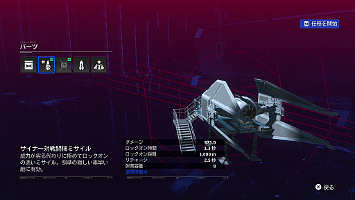 「サブウェポン」(増設ポイントにサブウェポンを搭載する),[○]で使用し追尾ミサイルを回避する「カウンターメジャー」などが搭載可能な