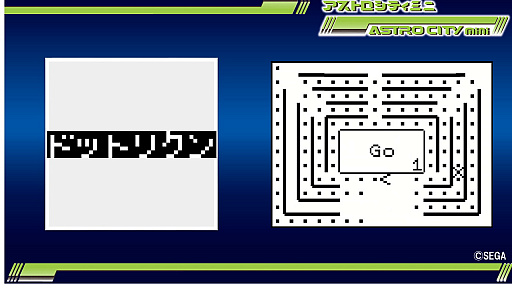 また,アストロシティミニに「ドットリクン」が収録されることも明らかになった。「ドットリクン」は,当時はアーケード向けの汎用筐体が,筐体単品で販売できなかった(※)ためアストロシティに標準搭載されていた,「ヘッドオン」を原型とするドットイートゲームだ。基本的には店舗で稼働させることが考えられていないテスト基板と呼ばれるものであるため,実際にプレイしたことがある人は関係者か基板屋に出入りするようなマニアくらいだろう。