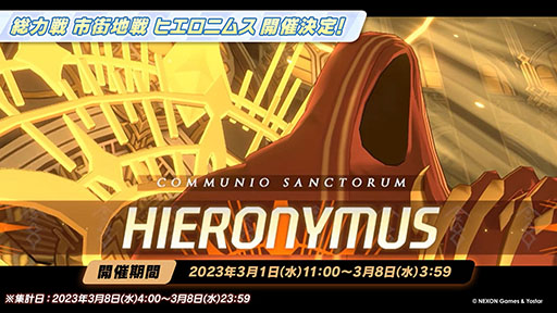 さらに,「ドロップ量2倍キャンペーン」が2月22日4:00より順次実施されるほか,「総力戦 市街地戦 ヒエロニムス」が3月1日11:00から3月8日3:59まで開催されることも明らかにされた。なお,今回の総力戦では,新たな難度「Torment」が追加されるとのこと。