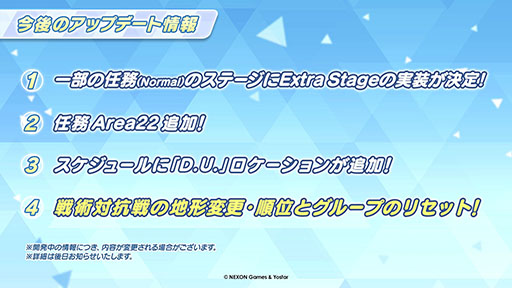 ロケーション「D.U.」 がそれぞれ追加されるほか,「新任教師ガイドミッション」のリニューアルや,過去に復刻済みのイベントストーリーの常設化などが予定されているという。