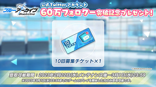 ブルーアーカイブ公式Twitterのフォロワー数が60万人を突破したことを記念して,「10回募集チケット」が1枚プレゼントされる。受取期間は2月22日のメンテ後から3月1日23:59までだ